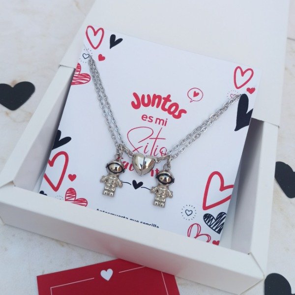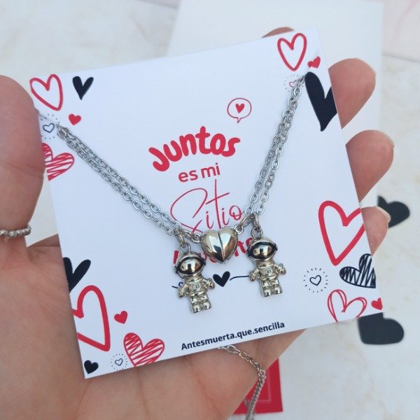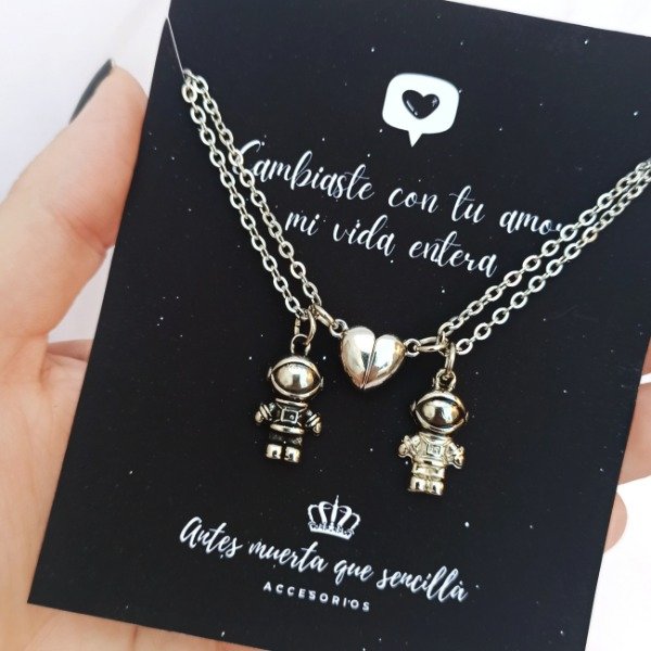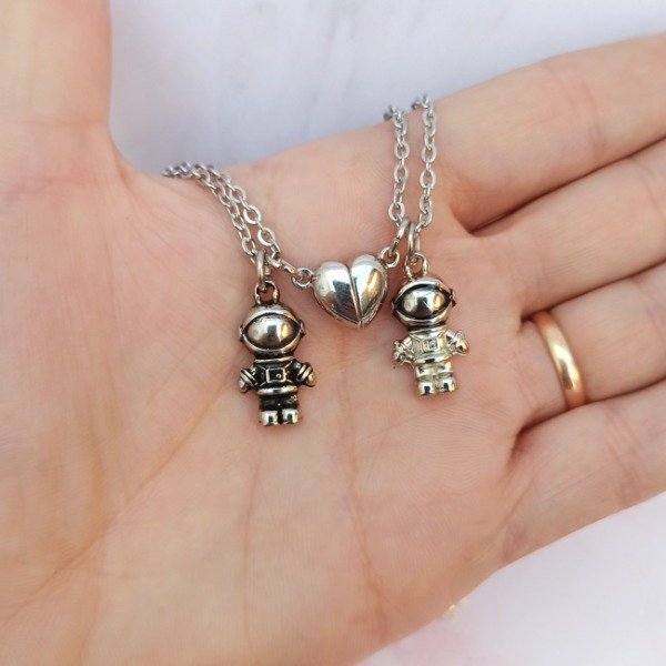 Par de collares de acero quirúrgico 45 cm con imán corazón y astronautas.