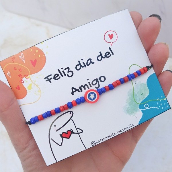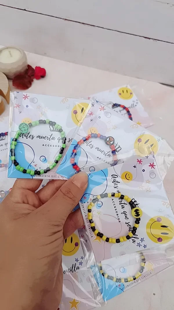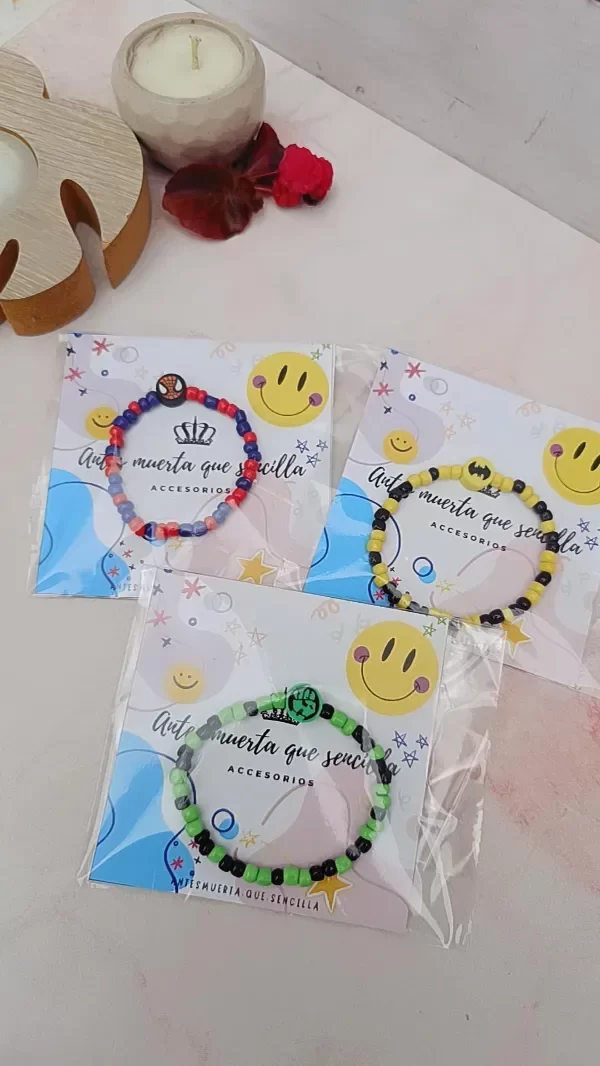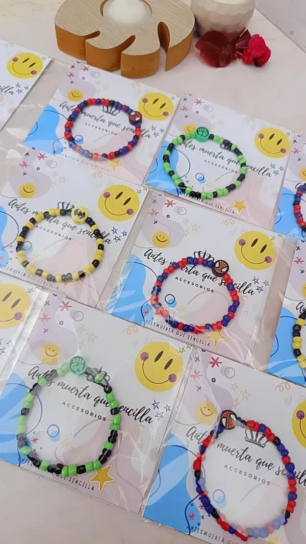 Pulseritas regulables con mostacillas y Super héroe de fimo.