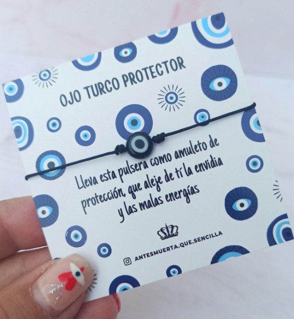 Pulsera regulable con ojo turco de vidrio color negro. Disponible también como tobillera
