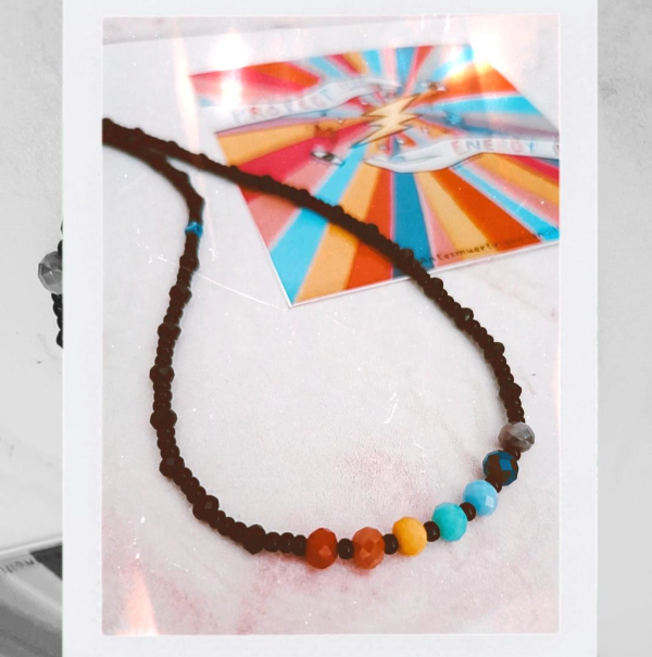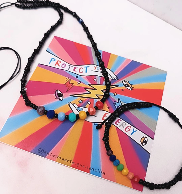 Pack de collar tipo choker más pulsera regulables con cristales, mostacillas y ojos turcos.