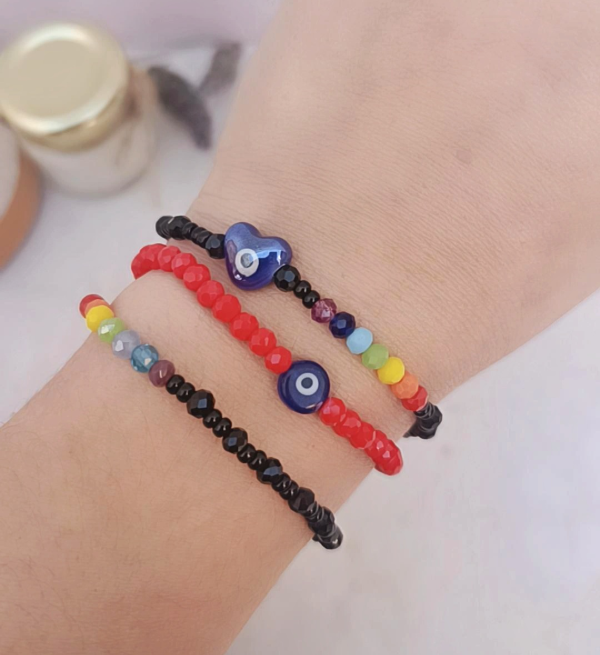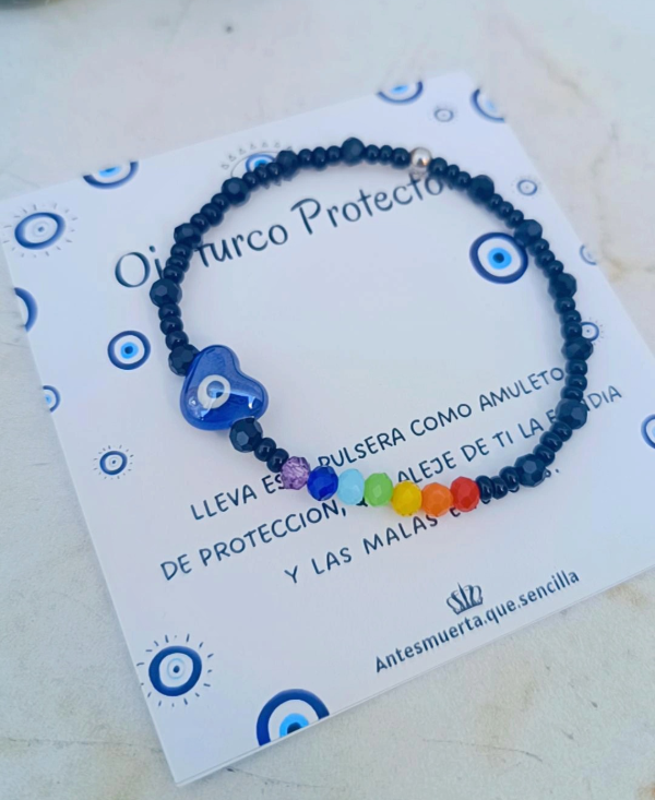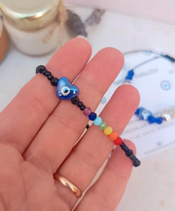 Pulsera elástica de cristales con ojo turco en forma de corazon de cerámica y cristales con los colores de los 7 chakras.